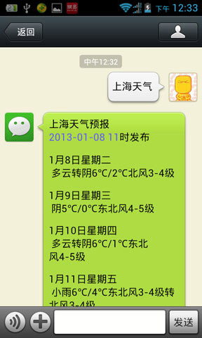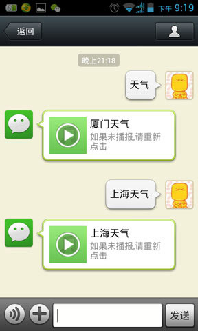 备注:如果后台开启语音播报天气功能,回复就是语音播报,更有意思!