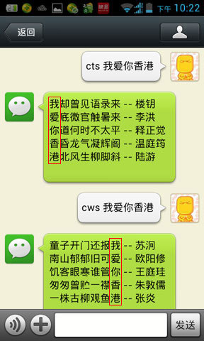 输入:藏头诗 我爱你香港 或者 cts 我爱你香港 或者藏尾诗 我爱你香港 或者 cws 我爱你香港