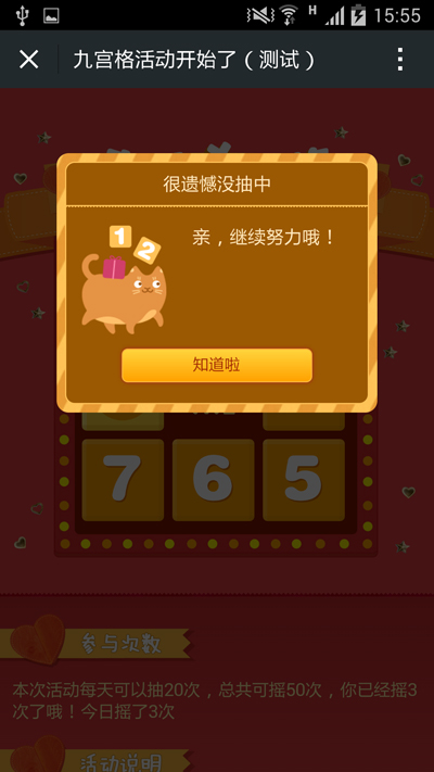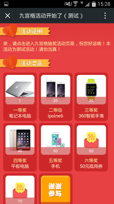 功能亮点:手机九宫格活动,让你犹如回到童年,简单直接的抽奖方式,用户参与简单,娱乐度高。